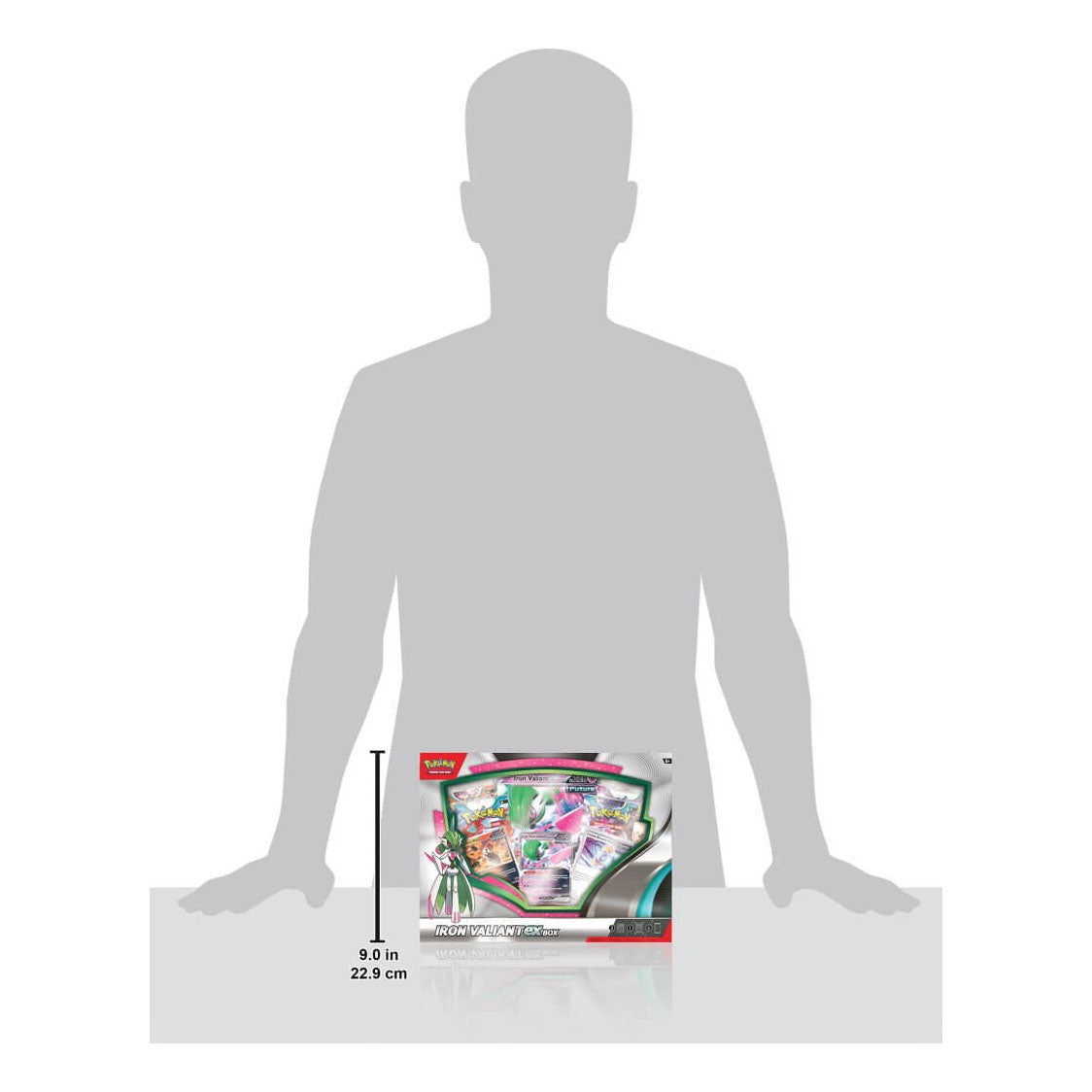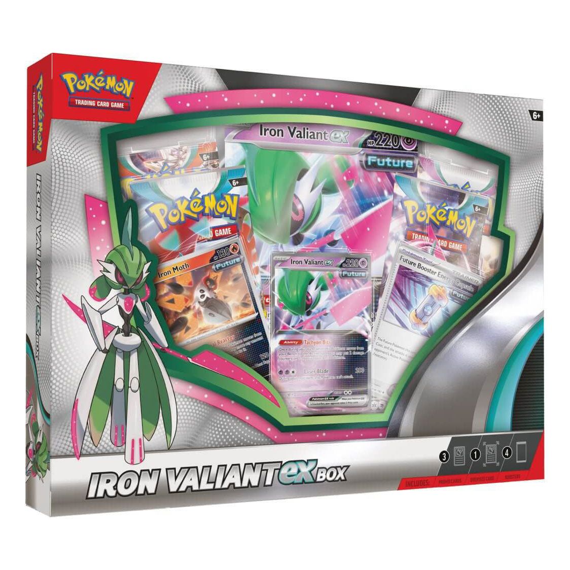 Awakening from a long-gone world is the ferocious Roaring Moon ex—while the resilient Iron Valiant ex beams in from the future! In this box, you get a promo card and an oversize card featuring either Roaring Moon ex or Iron Valiant ex. Roaring Moon ex is joined by Brute Bonnet and an Ancient Booster Energy Capsule, and Iron Valiant ex comes with Iron Moth and a Future Booster Energy Capsule—all things that your past self would want you to have to help you out in the future. Find even more helpful allies in the included Pokémon TCG booster packs!